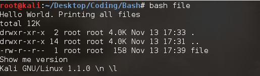 Done. Now, save it as file . Now, to execute it (if you are root user) then type bash file which will print Hello world in Terminal. Now, Shell Scripting is all about commands . Let me list all files with their permission.
